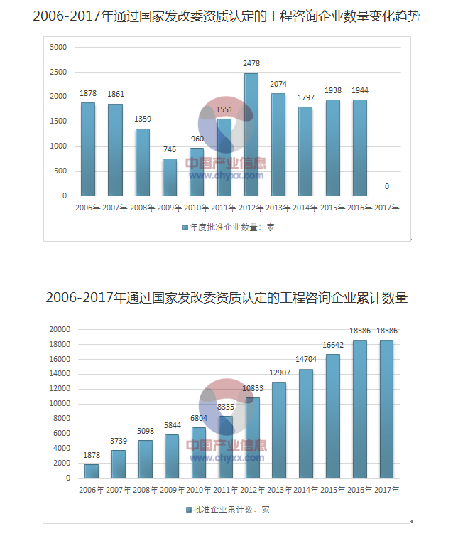 2006年開始,國家發(fā)改委開展工程咨詢單位資格認(rèn)定工作。2005年之前發(fā)改委原頒發(fā)的臨時(shí)級、預(yù)備級、丙級工程咨詢資格證書有效期截止至2005年12月31日,需要重新申請工程咨詢資格。持有正式甲、乙級工程咨詢資格證書的單位,2006年另行申請工程咨詢資格。因此此處統(tǒng)計(jì)口徑主要是2006年以來通過國家發(fā)...